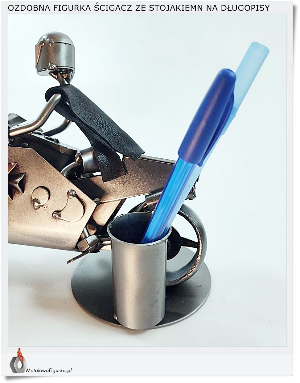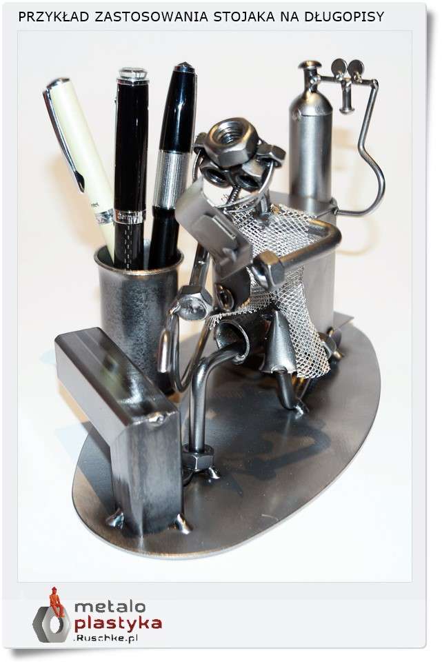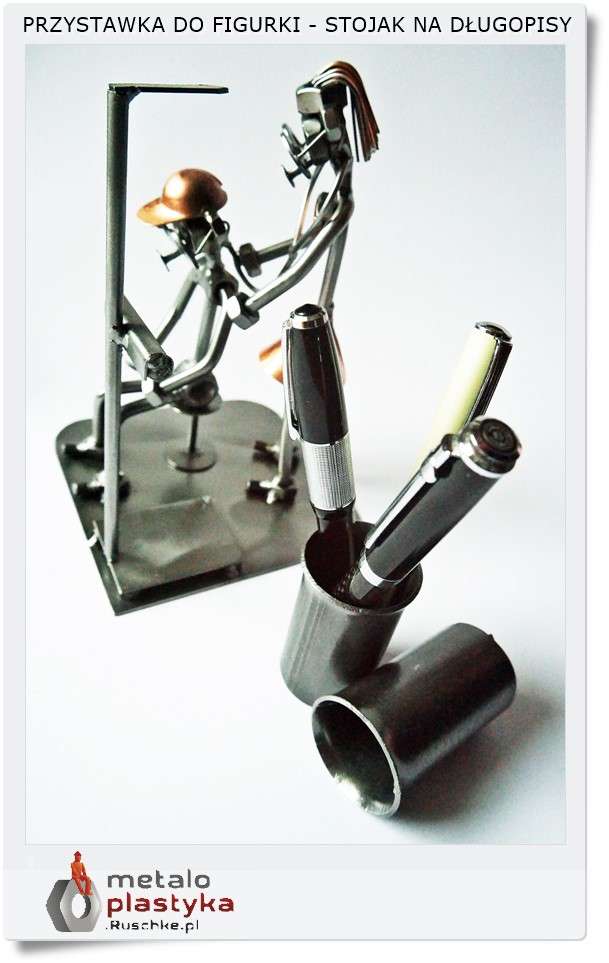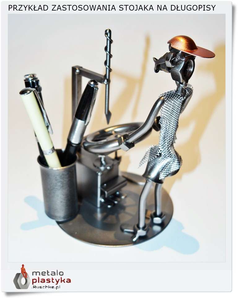 Metalowa figurka w formie stojaka do długopisów spełnia funkcję użytkową i zarazem dekoracyjną.