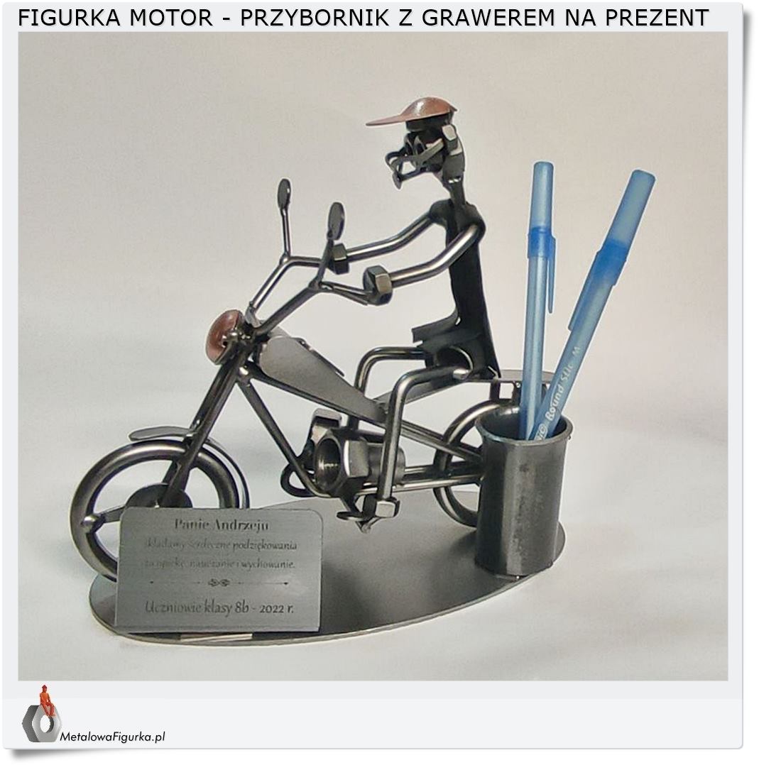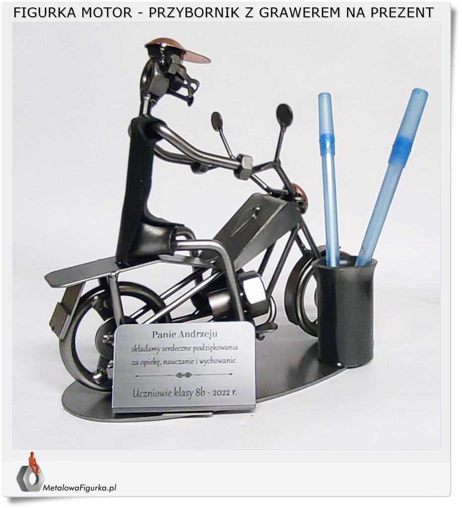 Metalowy przybornik na biurko w formie statuetki "Motocykl" jest użytkową ozdobą i jednoczesnie niezapomnianym prezentem dla motocyklisty.