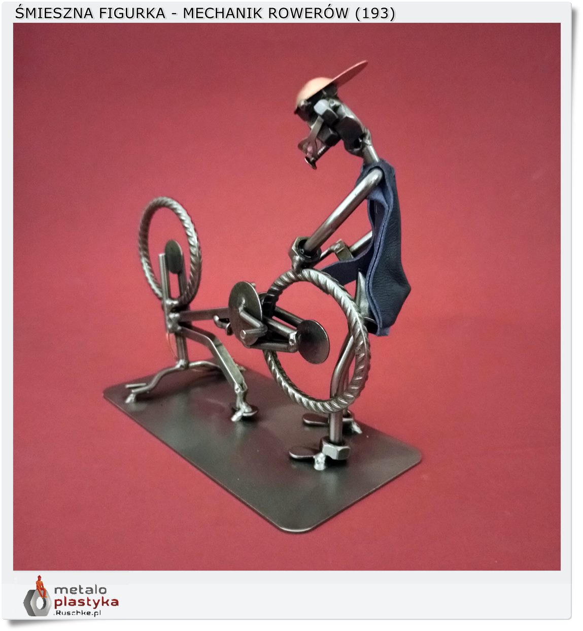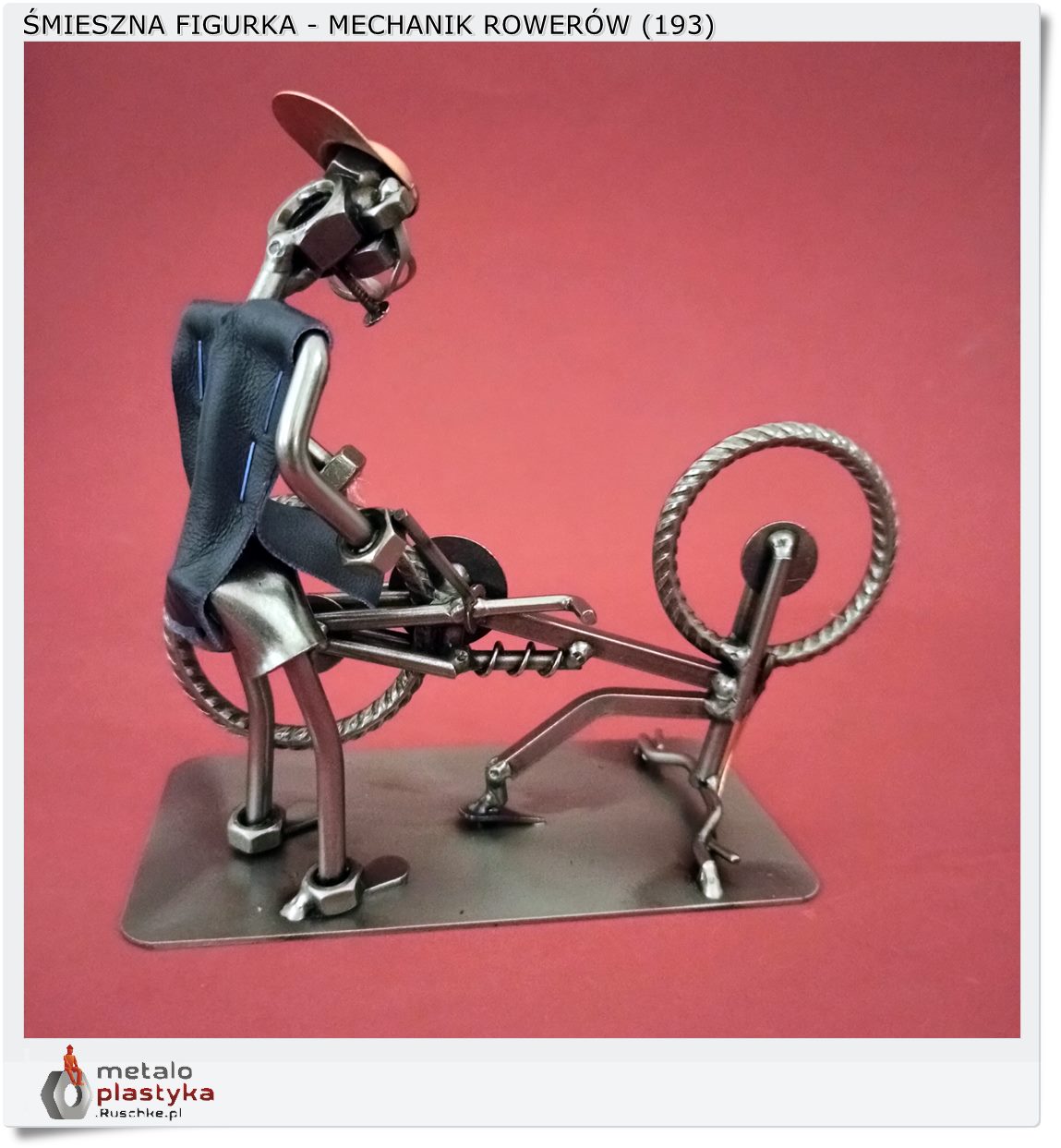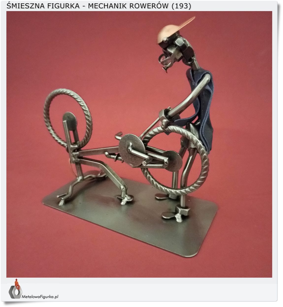 Ta ręcznie wykonana figurka z metalu ukazuje mechanika w trakcie naprawy roweru.